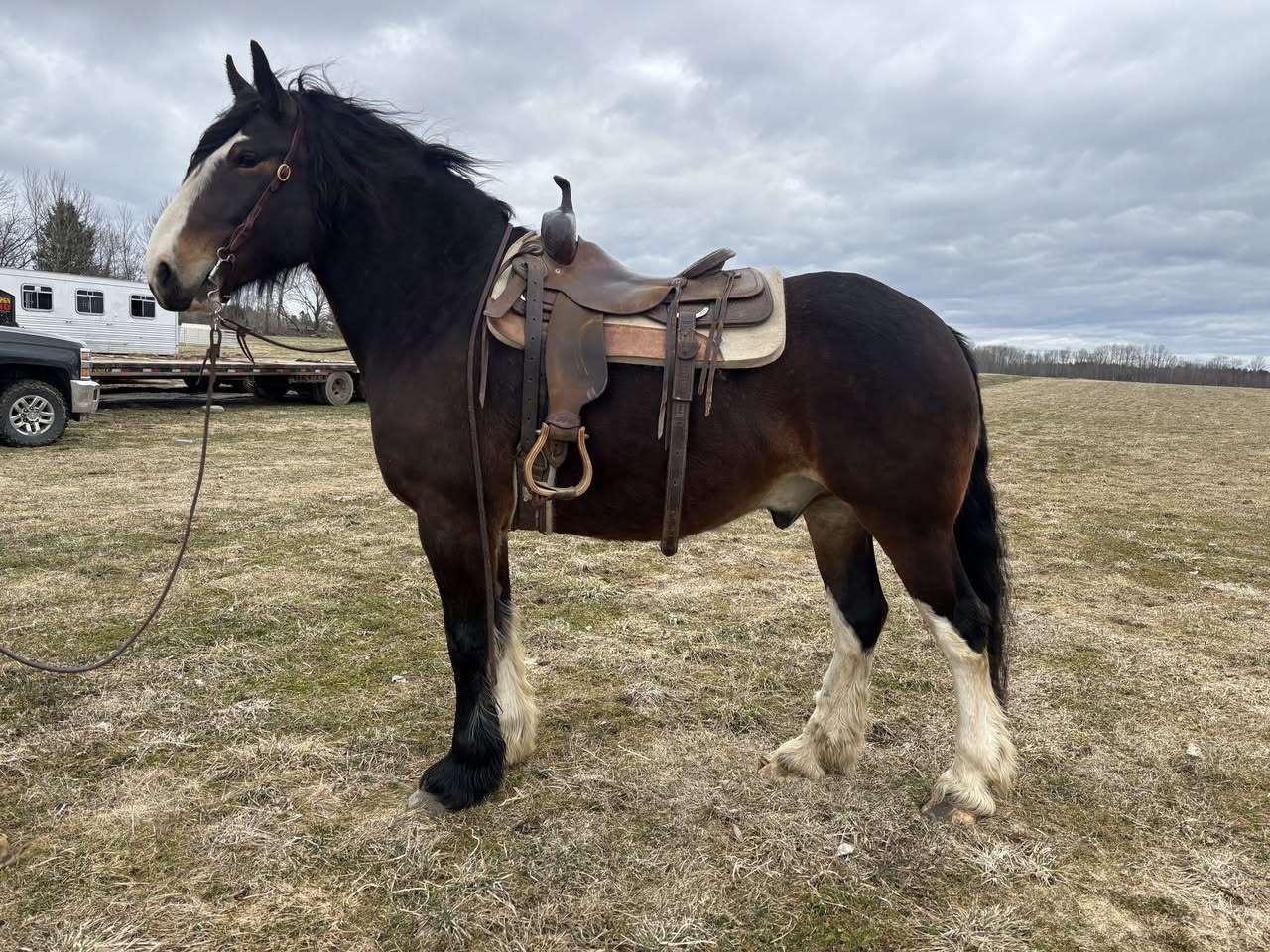 Tatum is a 5yo 15.2hh Friesian cross gelding. This is a one of a kind gelding with the most friendly temperament you can get. This guy will run up to you in the pasture and is the first one to meet you at the door. He loves to be around people. He is very well trained, he has a beautiful floaty lope, flying lead changes and will maneuver off your feet. Tatum has done it all he as even been in carriage in the middle of St. Louis city. You can ride him anywhere and everywhere, nothing works him up. We had him in the water and in traffic and he is one cool dude. Another cool thing about Tatum is he is trained to lay down and sit like a dog! This is an extremely broke horse that could go to showing, jumping, you name it, but could also ride the whole family around. This is one special horse that really can do it all.